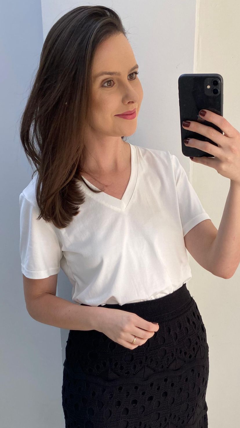 Camiseta 100% cotton, com decote V que traz um toque de leveza e elegância. Macia, respirável e perfeita para o dia a dia com muito conforto e estilo