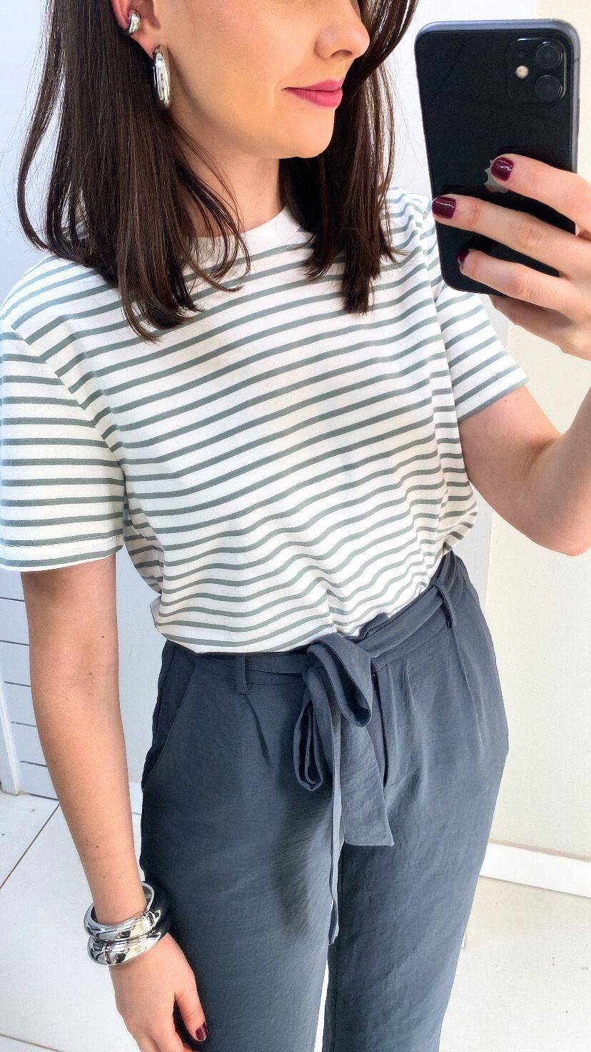 CAMISETA VERDE ACINZENTADA E BRANCO LISTRADA DE COTTON COM ELASTANO MANGA CURTA