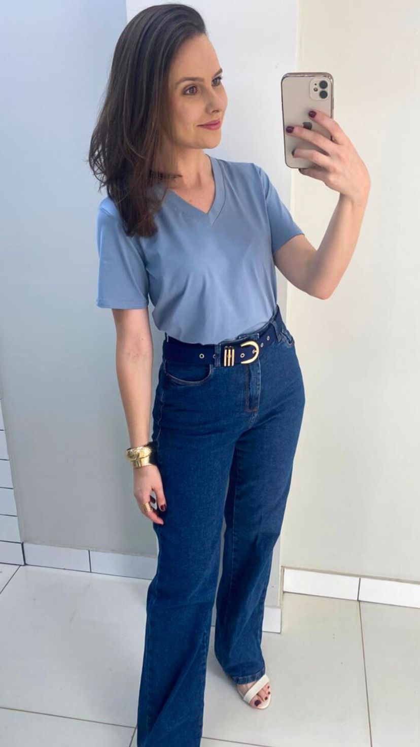 CAMISETA AZUL CLARO 100% COTTON DE MANGA CURTA E DECOTE V
