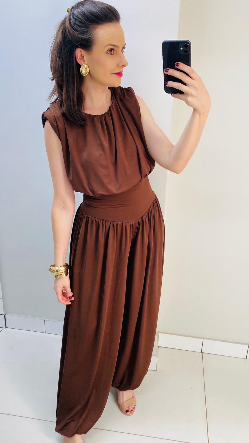 MACACÃO ALADIM MARROM COM OMBREIRAS MODELO ACINTURADO COM BASTANTE ELASTANO