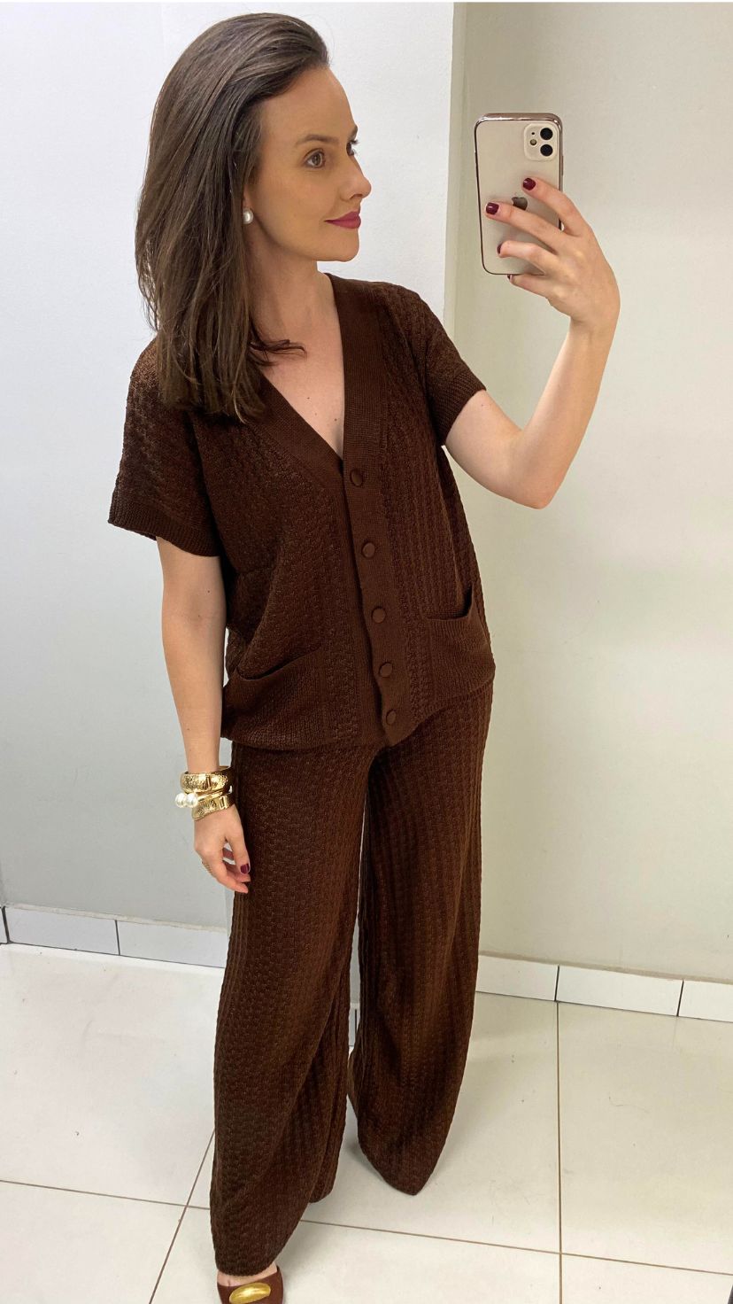 Conjunto de tricot marrom com toque macio e caimento impecável. Confortável e sofisticado, é perfeito para criar looks elegantes e modernos. Ideal para qualquer ocasião, une estilo e praticidade com charme atemporal