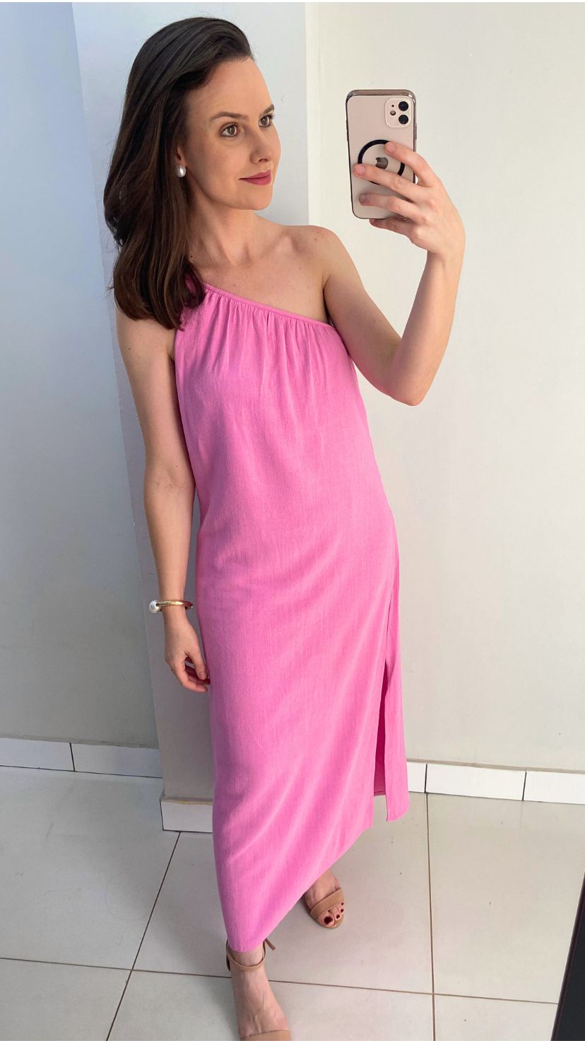 VESTIDO DE ALCINHA ROSA DE UM OMBRO SÓ FORRADO, VISCO LINHO COM ZÍPER LATERAL