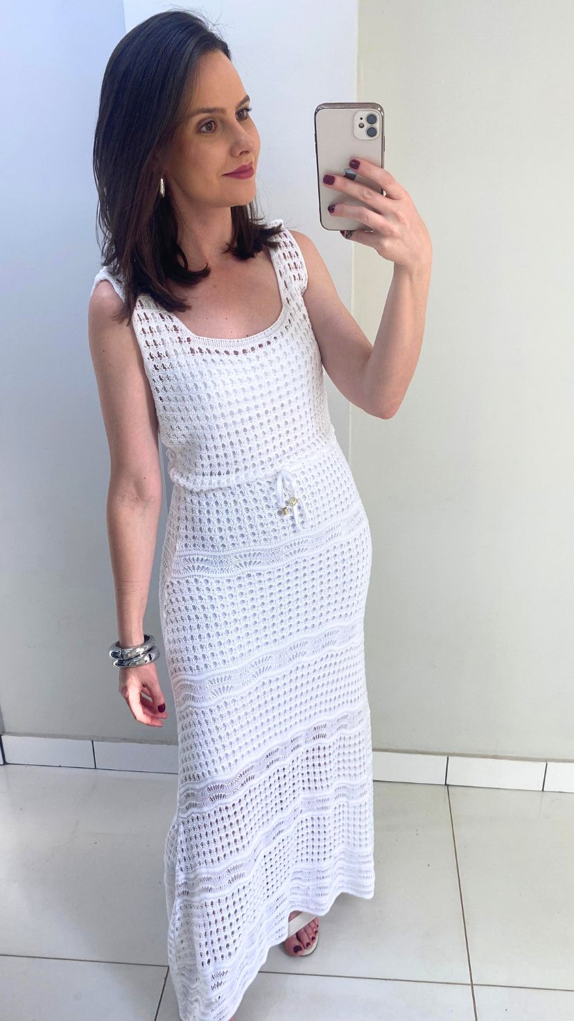 VESTIDO REGATA BRANCO DE TRICOT COM FORRO AVULSO E AMARRAÇÃO NA CINTURA